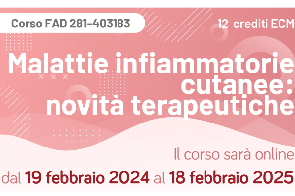 Costo: gratuito Ecm: 12 crediti Modalità: a distanza Quando: fino al 18 febbraio 2025 Argomenti: il corso si propone di affrontare nuovi percorsi clinici per due malattie importanti come la psoriasi e la dermatite atopica. La psoriasi – scrivono gli organizzatori – è una malattia infiammatoria cronica che colpisce prevalentemente, ma non esclusivamente, la cute.…