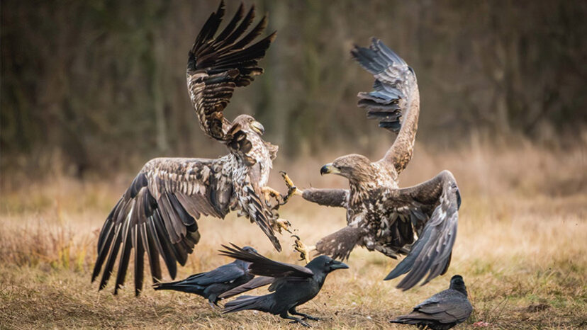 Siamo in Polonia: due aquile si scontrano, presumibilmente per contendersi un brandello di una preda. Sullo sfondo, come spettatori interessati, tre corvi sperano che i due rapaci lascino loro qualcosa. Uno scatto che conferma quanto sia fondamentale per un fotografo essere pronto, trovarsi nel posto giusto al momento giusto e saper cogliere l’attimo.