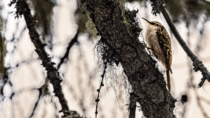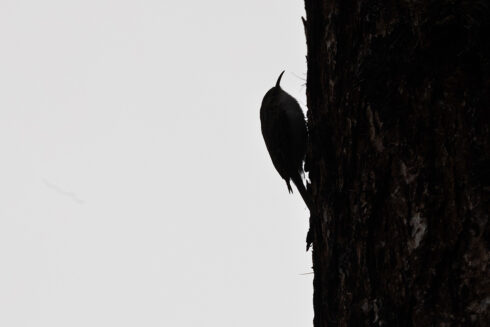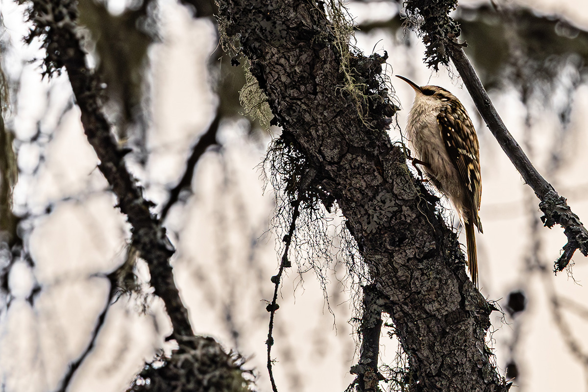 Lo scatto di Carlo Emanuelli, nel silenzio profondo della Val di Peio, nel cuore del Parco Nazionale dello Stelvio, ritrae un piccolo rampichino (passeriforme che vive nei boschi) che si arrampica lungo il tronco muschiato di un vecchio albero. È una fotografia ben bilanciata, con un forte valore estetico e naturalistico, che trasmette una sensazione di silenzio e osservazione attenta. La luce, fredda e diffusa, filtra tra i rami, accarezzando la corteccia ruvida e creando colori delicati che tendono al grigio, mettendo in risalto i dettagli del tronco dell’albero e del piccolo uccellino.