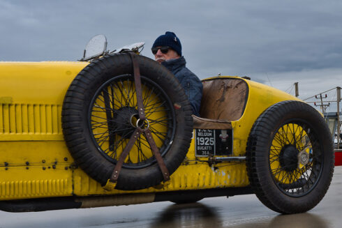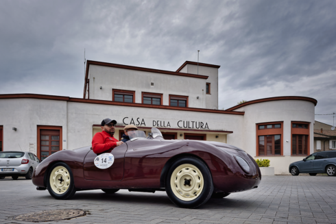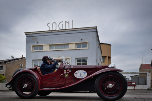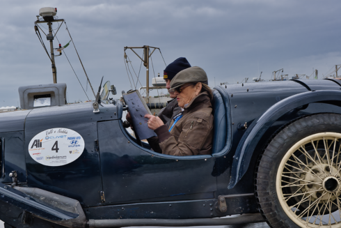 Nell’immagine di Remo Lanzoni, cardiologo in pensione, la vettura bordeaux avanza con misura. La sua non è una sfida contro il tempo, ma un viaggio nella memoria. A bordo, piloti con caschi e occhiali d’altri tempi che sembrano emersi da un racconto degli anni Trenta.