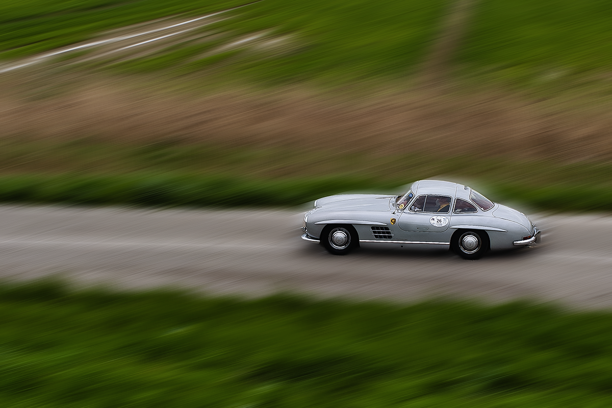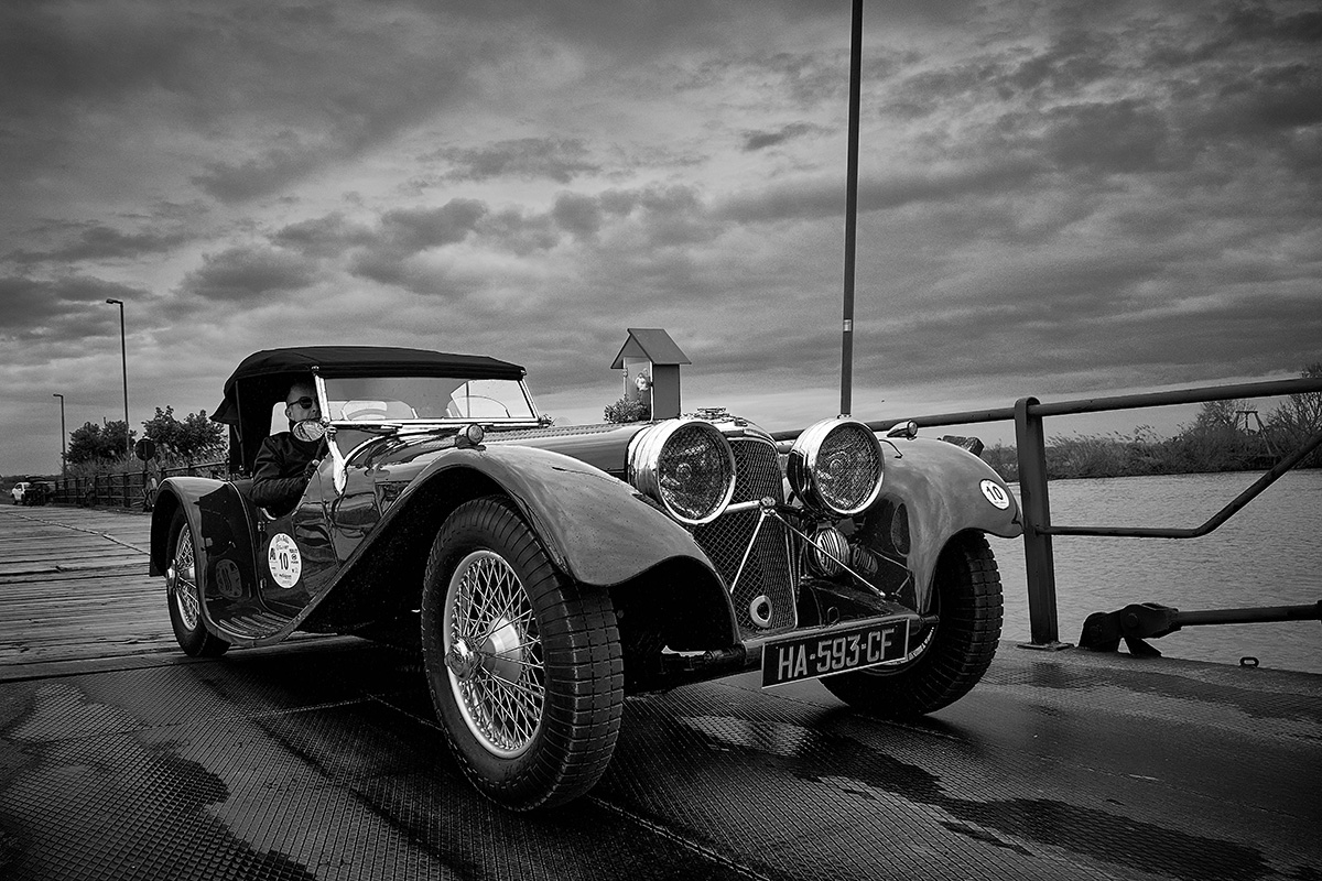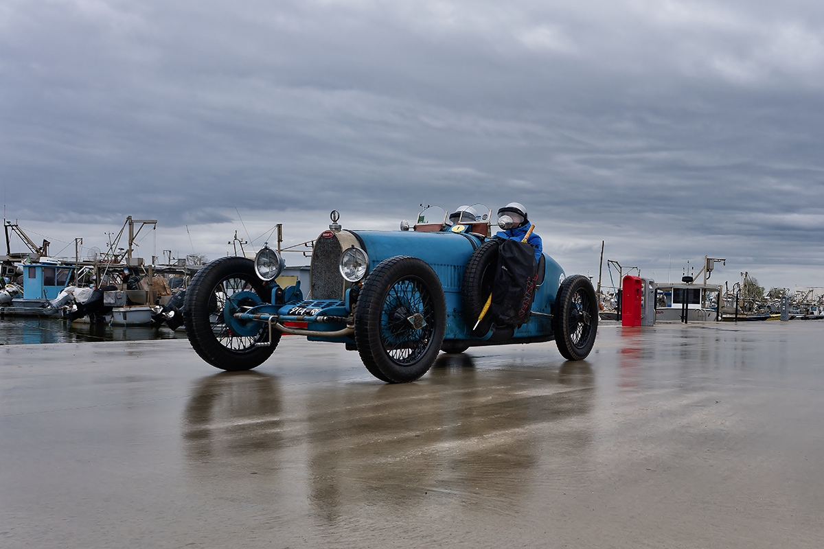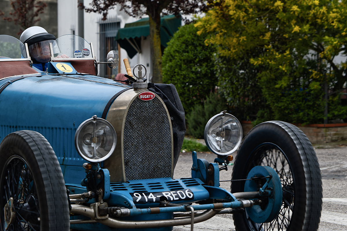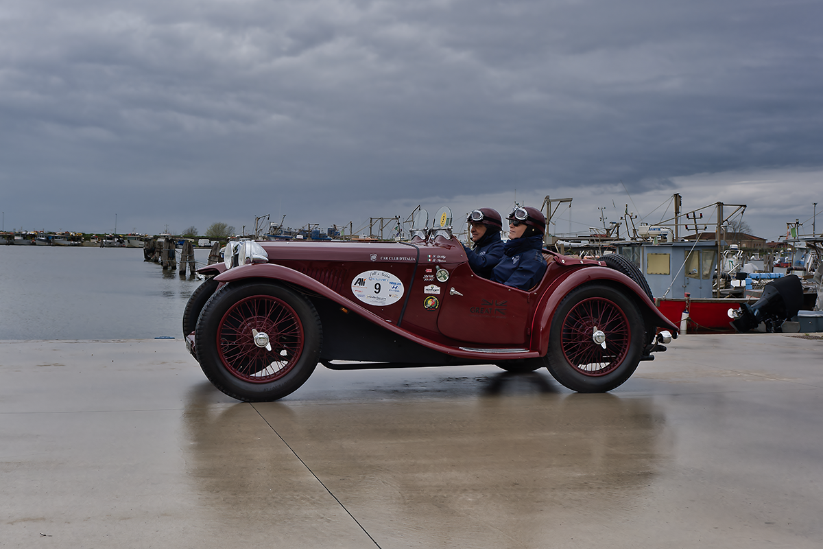 Nell’immagine di Remo Lanzoni, cardiologo in pensione, la vettura bordeaux avanza con misura. La sua non è una sfida contro il tempo, ma un viaggio nella memoria. A bordo, piloti con caschi e occhiali d’altri tempi che sembrano emersi da un racconto degli anni Trenta.
