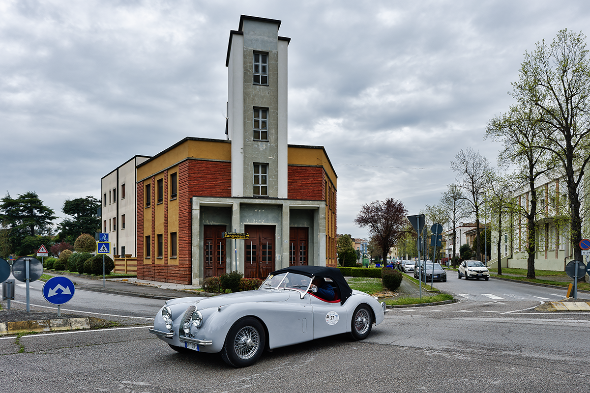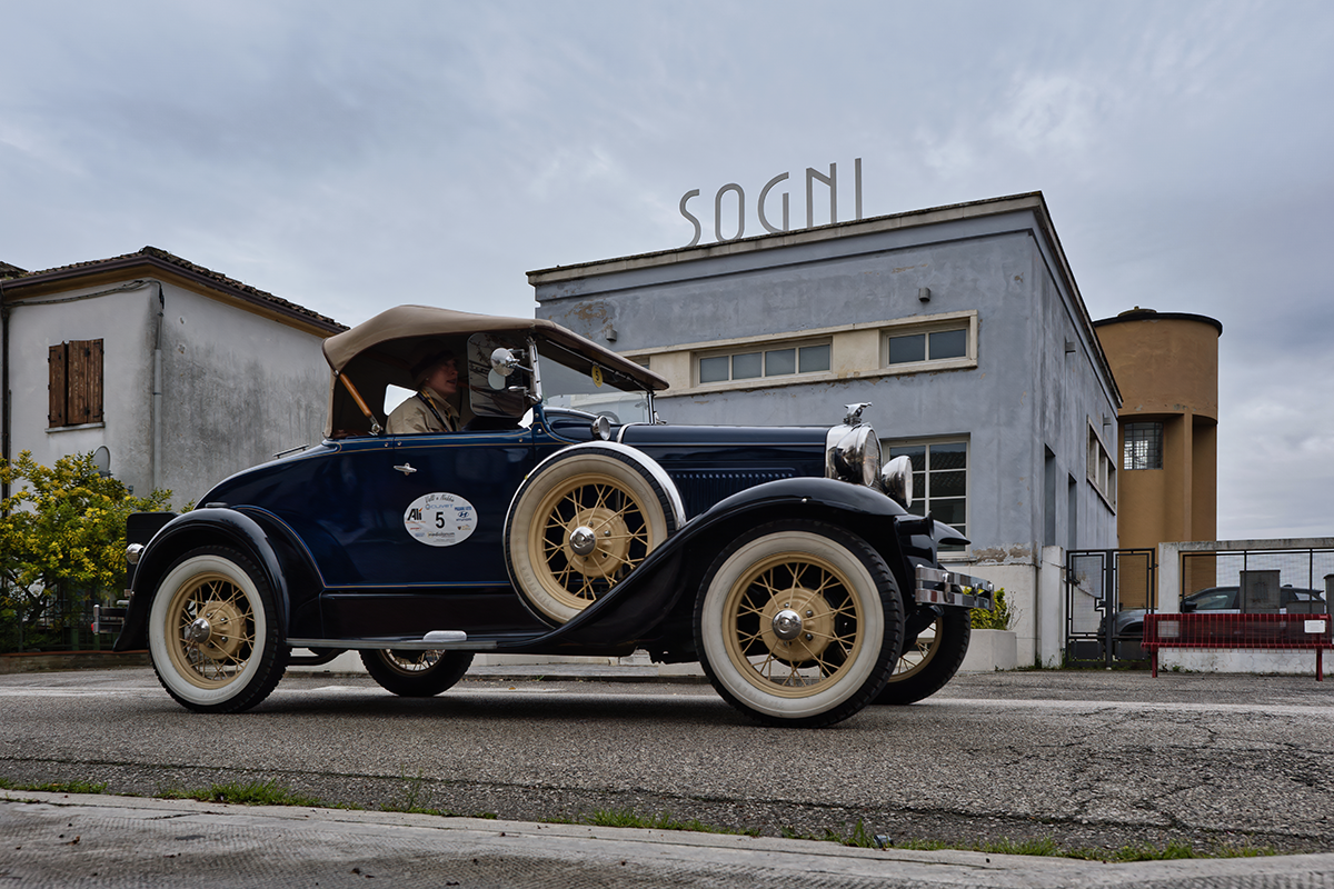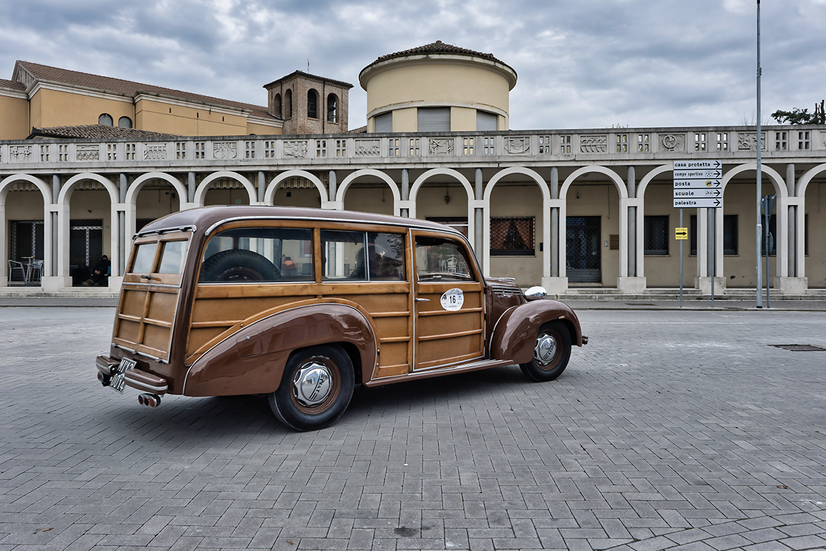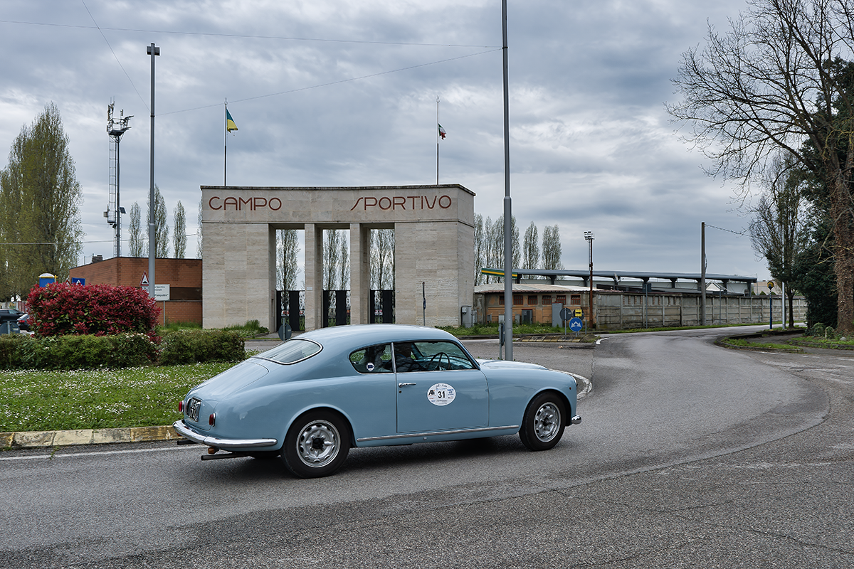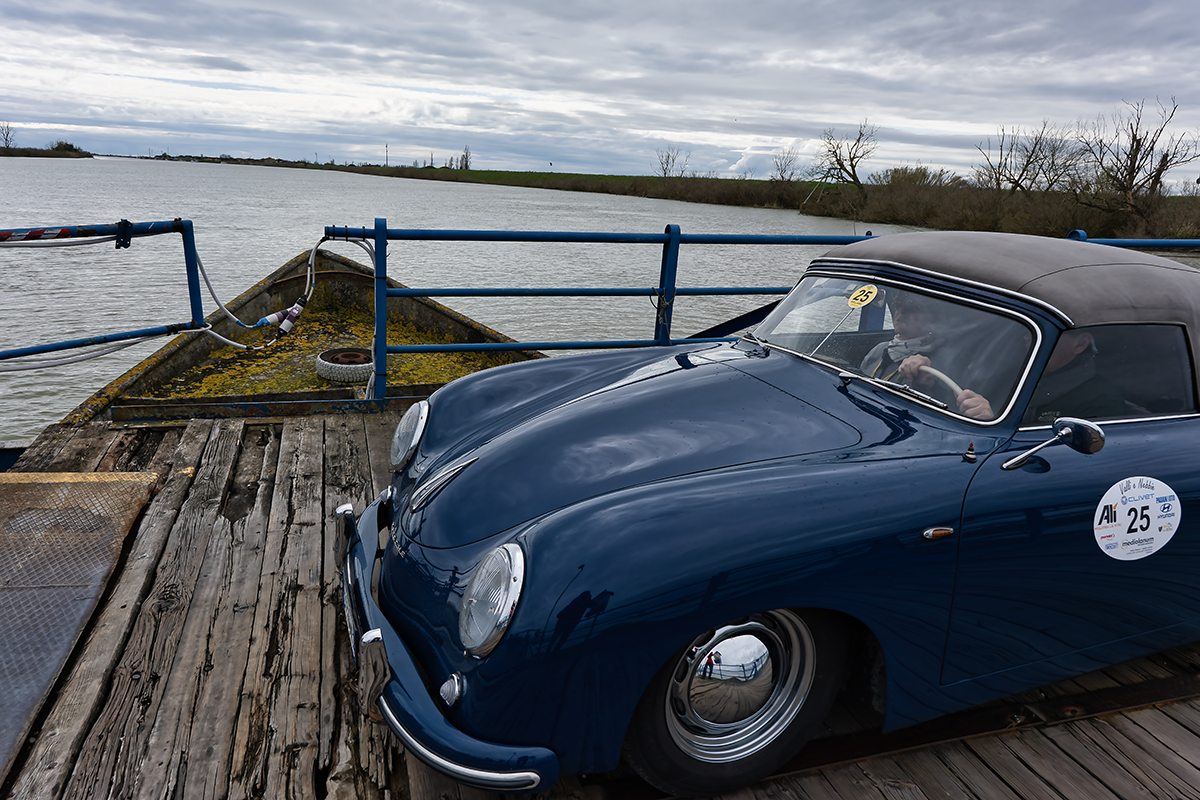 Il passaggio di un’auto d’epoca durante una gara di regolarità lungo le strade della provincia di Ferrara si trasforma in visione.