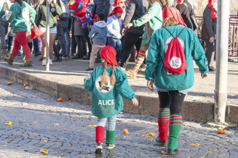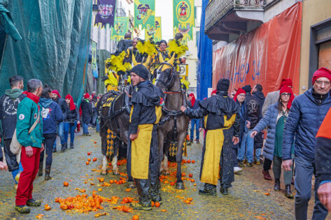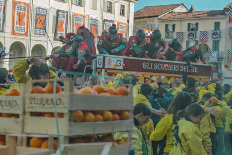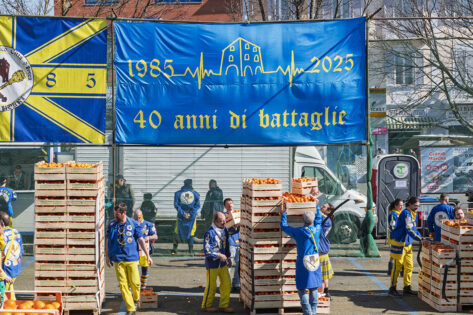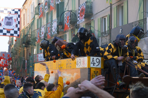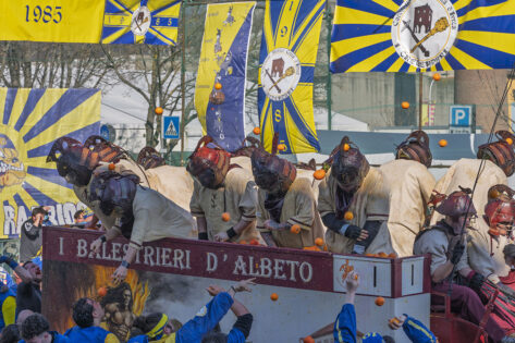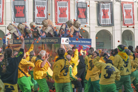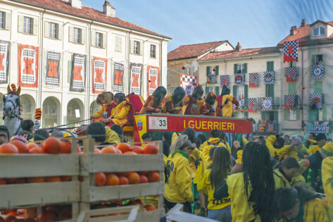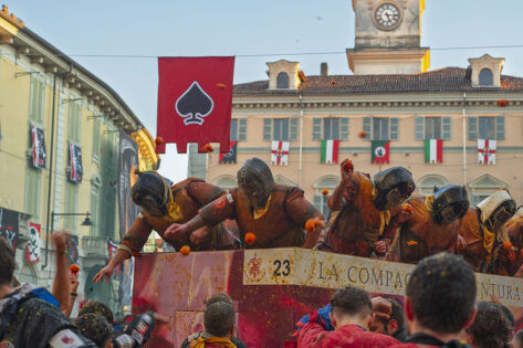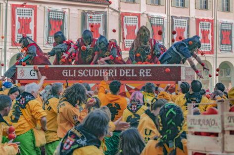 La foto scattata da Carla Sogos ritrae un momento della famosa Battaglia delle arance, evento che si tiene annualmente a Ivrea durante il carnevale.
