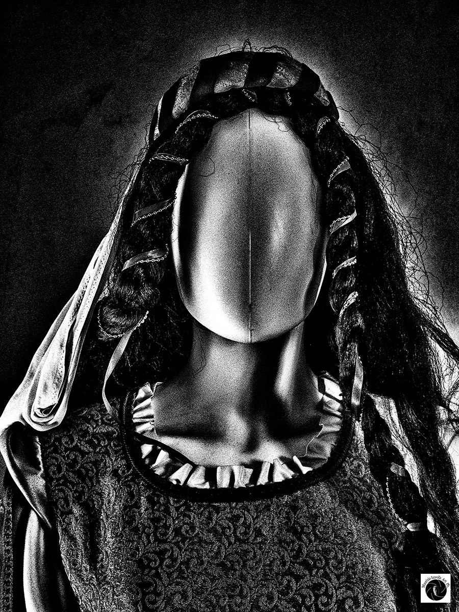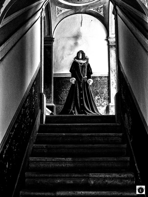 Protagonista è una figura in costume d’epoca, Maria d’Avalos, la cui sagoma appare in cima a una scalinata in pietra. Il manichino vestito con un abito rinascimentale – lungo, scuro, impreziosito da bottoni, ampi polsini decorati e un colletto elaborato – emerge drammaticamente dalla penombra. Il volto privo di fattezze contribuisce a creare un’atmosfera misteriosa, quasi spettrale. L’architettura antica, con archi e muri segnati dal tempo, amplifica il senso di malinconia e la memoria storica.