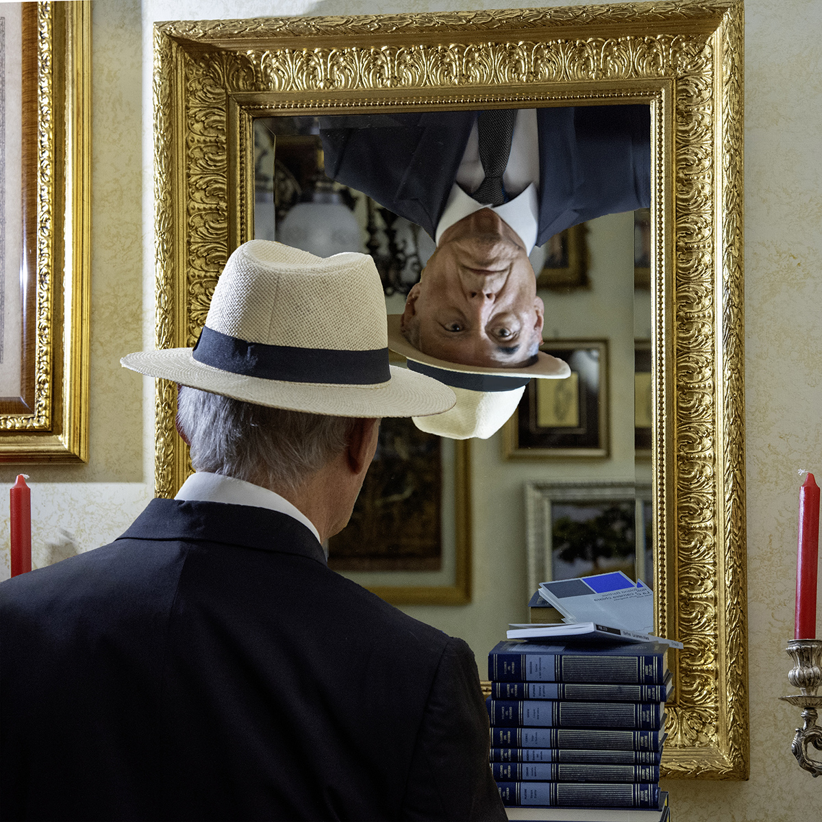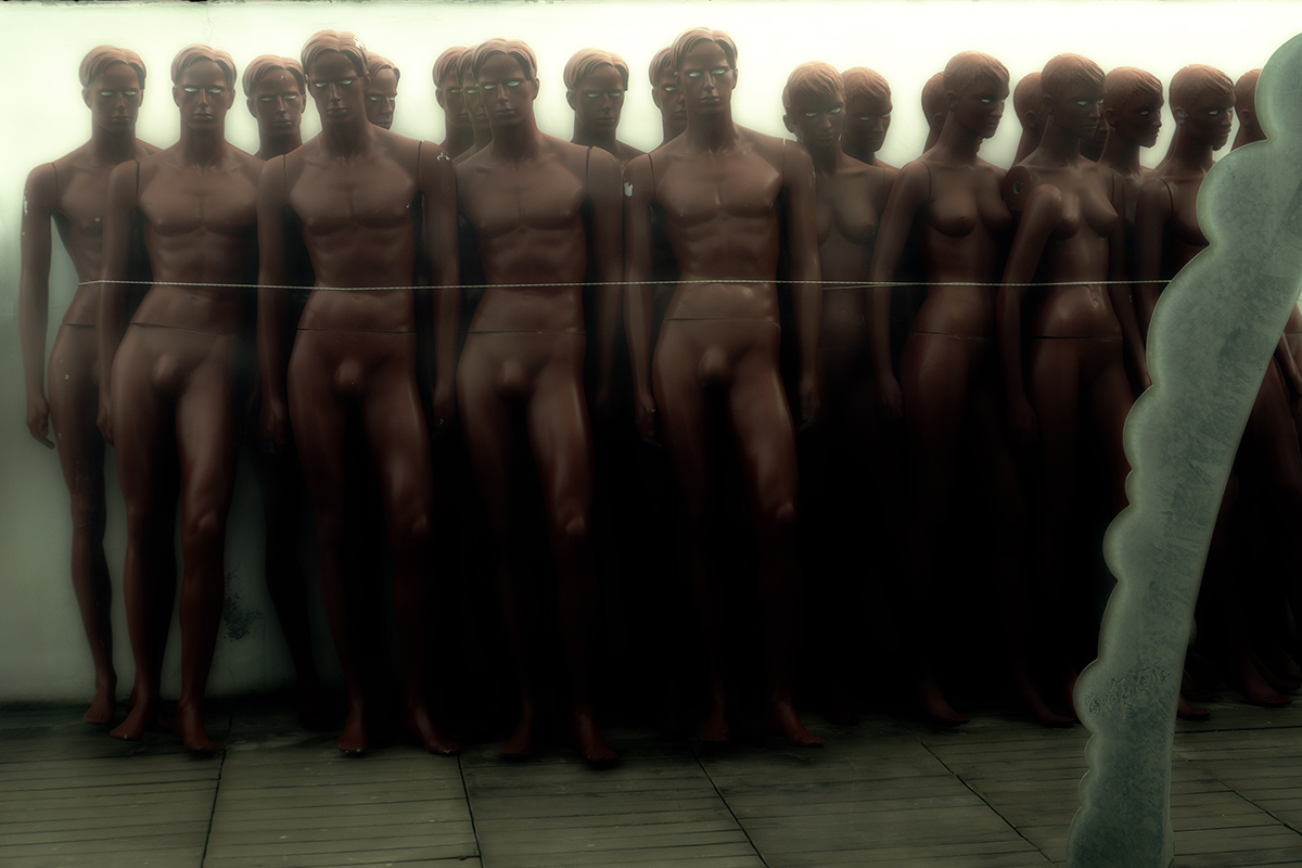 Il contrasto di luci è fortemente teatrale: la scalinata resta immersa nell’ombra, mentre una luce intensa illumina il punto esatto in cui si trova il manichino.