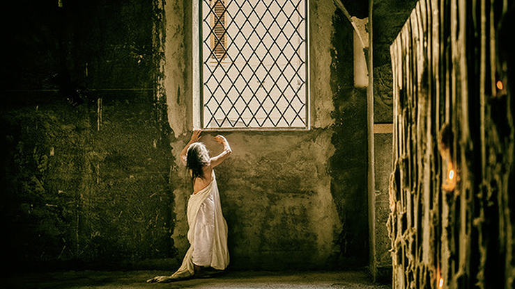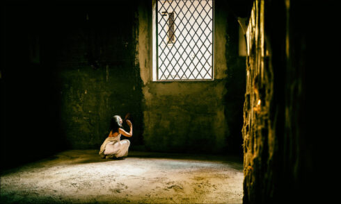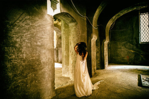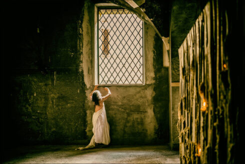 Davanti a una finestra a grata, c’è una figura femminile in silenzio. Indossa un abito bianco, il cui strascico lunghissimo si allunga sul pavimento come un drappo leggero, la luce che filtra la sfiora con delicatezza e in quel gesto immobile si avverte un senso di attesa, di raccoglimento, ma anche di resistenza. Come se il suo stesso corpo stesse cercando una via per liberarsi, dal buio che l’ha circondata.