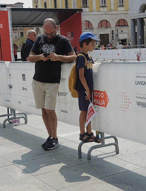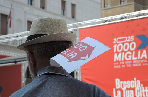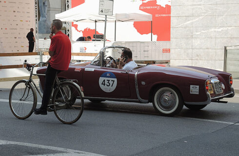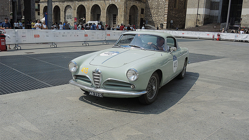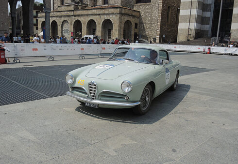 Nel cuore vibrante di Brescia, tra le pietre storiche della città e il mormorio della folla, una splendida Alfa Romeo d’epoca avanza con grazia lungo il percorso della leggendaria Mille miglia.