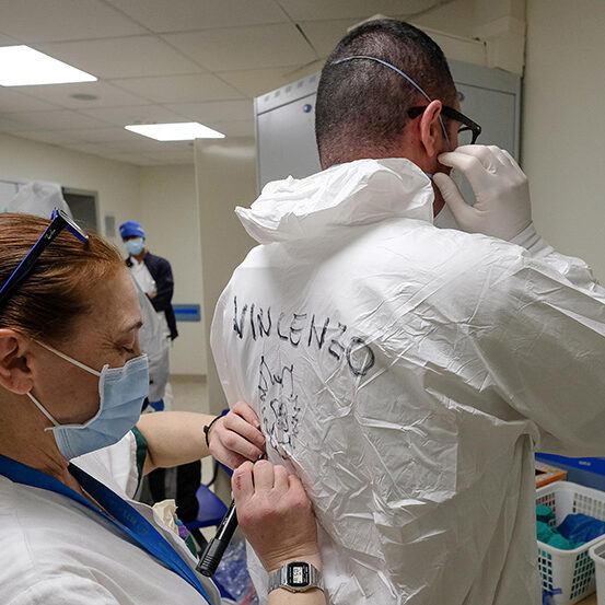 Tra le sue foto, abbiamo scelto quella scattata all’ospedale San Filippo Neri di Roma l’8 aprile 2020. L’immagine ritrae un sanitario che aiuta a vestire un collega e gli scrive il nome sulla schiena, come fosse una tuta di una squadra sportiva.