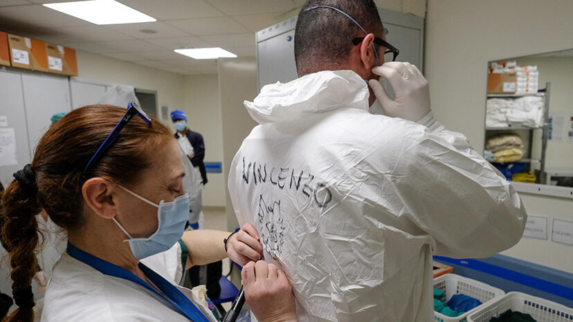 Operazioni di vestizione di medici e infermieri nel reparto Covid dell’ospedale San Filippo Neri, Roma, 8 aprile 2020.