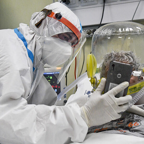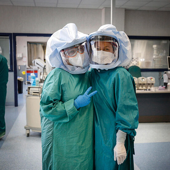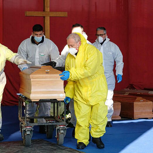 Quelle delle bare sui camion nelle strade di Bergamo, delle città deserte, dei pazienti con i caschi nei letti d’ospedale, delle corsie strapiene, degli abbracci attraverso i vetri delle Rsa, dei medici, gli infermieri, il personale sanitario stremato – irriconoscibile all’interno delle tute protettive – con gli occhi stanchi e stravolti, dietro le maschere protettive.