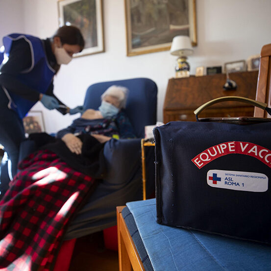Il sanitario che abbraccia una persona anziana ripreso dall’esterno della clinica in cui è confinata, è uno degli scatti che abbiamo scelto tra quelli di Filippo Venezia, fotoreporter freelance che collabora con l’Ansa. La foto, scattata il 12 maggio 2021 nel Rsa “Casa di Dio”, a Brescia, racconta tutta l’umanità del personale medico e sanitario, nonché la solitudine degli ospiti delle residenze per anziani.