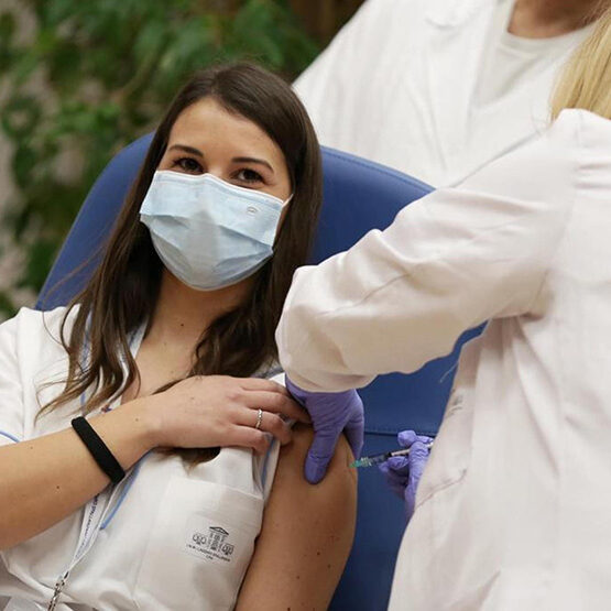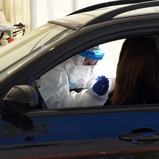 “Era una situazione nuova e ho cercato di documentare un po’ tutto quello che accadeva intorno all’emergenza coronavirus, negli ospedali e fuori”. Il racconto è quello di Tania Cristofari, fotografa freelance dell’agenzia Contrasto. Tra i suoi scatti abbiamo selezionato quello che ritrae un medico che effettua il tampone a un paziente seduto in auto in un centro vaccinale romano e quello della vestizione di un medico.