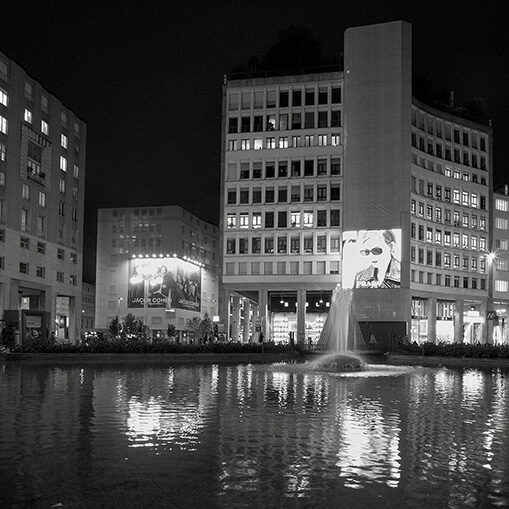 La composizione acquista movimento, per la presenza dei piccioni, alcuni appoggiati sul leone e altri che volano in alto nella piazza. Il bianco e nero è ben contrastato creando un perfetto equilibrio tra chiaro e scuro.