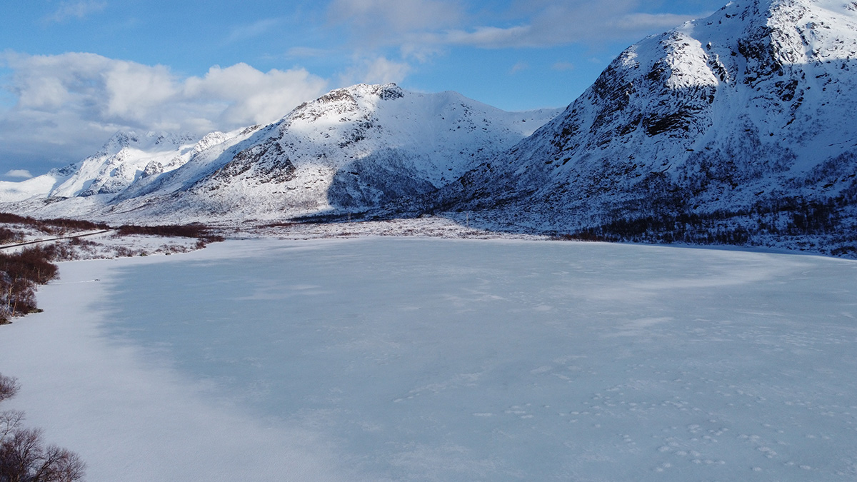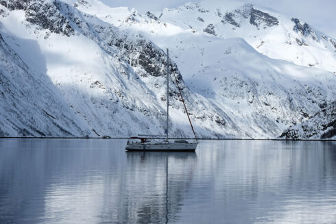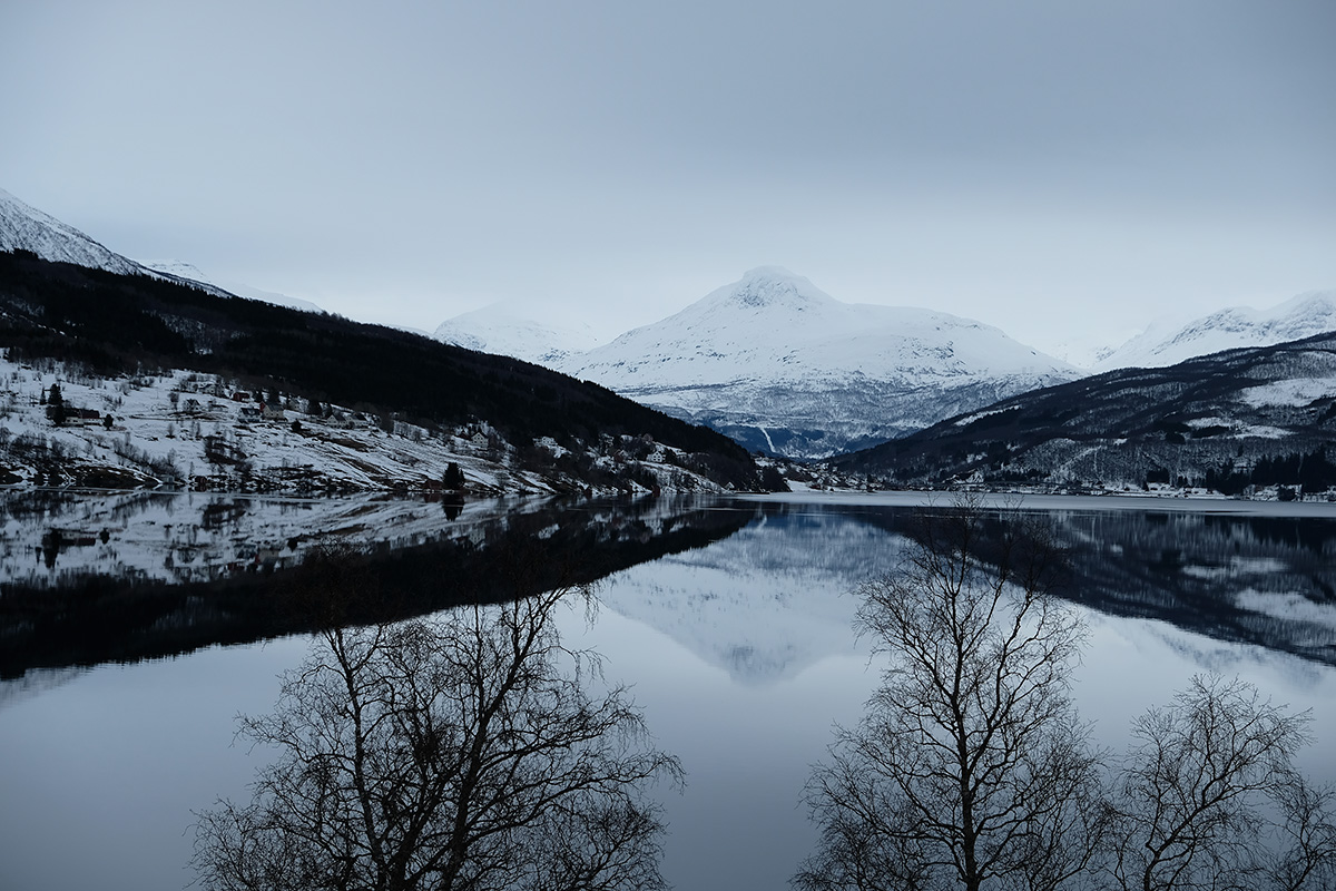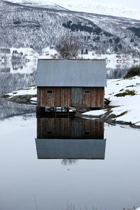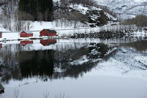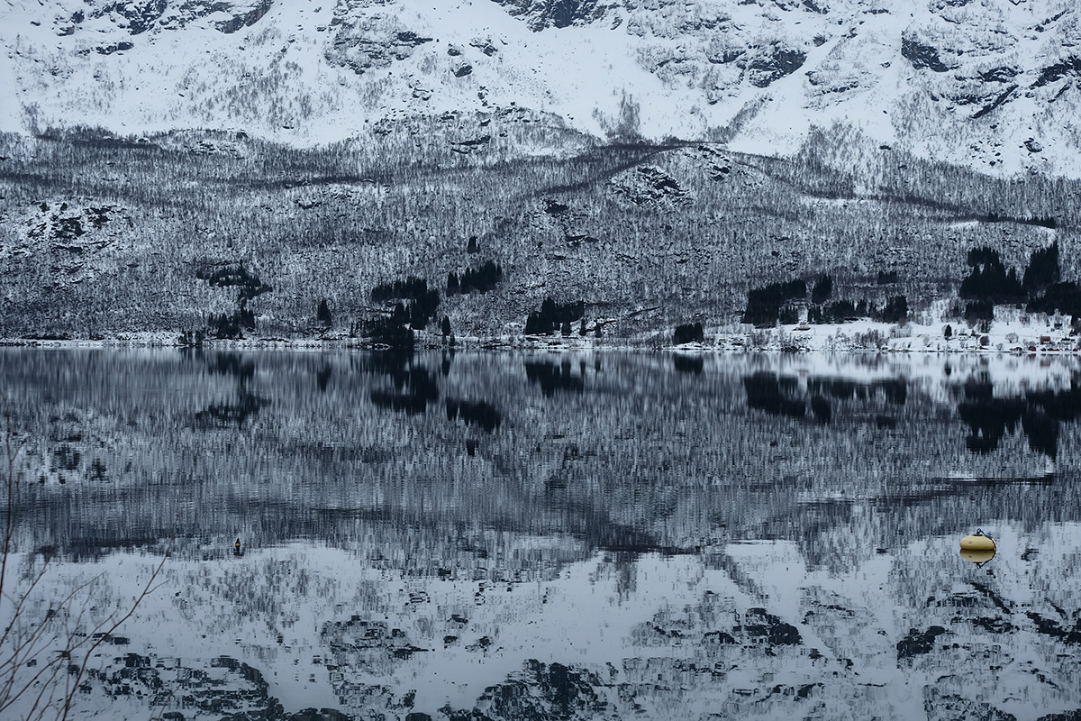 Nella fotografia di un paesaggio norvegese, scattata da Roberto Guiot, di Moncalieri in provincia di Torino, il paesaggio sembra sospeso in un silenzio assoluto. Le montagne innevate si riflettono nell’acqua immobile del fiordo creando una scena di grande purezza visiva ed emotiva.