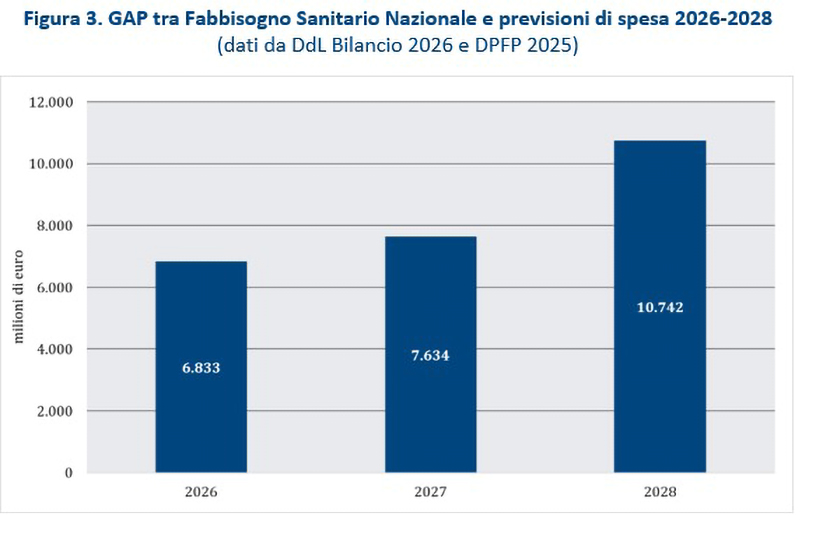 Un altro punto critico sollevato da Gimbe riguarda il forte divario tra le risorse destinate al Fsn e le previsioni di spesa sanitaria. Nel 2026, il gap è di 6,8 miliardi di euro, cifra che cresce nei due anni successivi, arrivando a 7,6 miliardi nel 2027 e 10,7 miliardi nel 2028.